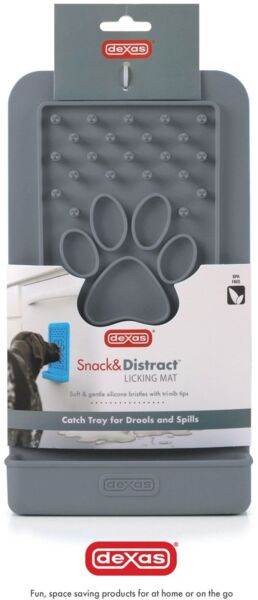 Вертикальный коврик для слизывания лакомств Dexas Snack & Distract с силиконовыми утроенными на кончиках выступами помогает собакам и кошкам справиться с тревогой, скукой, обеспечивает активный досуг и отвлекает питомца во время стрессовых ситуаций (визит к ветеринару, купание, подстригание когтей, во время громких звуков). Как использовать: распределите любимое лакомство вашей собаки по всей длине мягких силиконовых щетинок (арахисовое масло или йогурт подойдут как нельзя лучше).