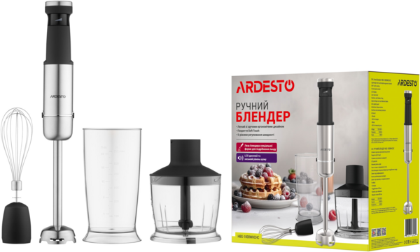 Ручний занурюваний блендер Ardesto виготовлено з якісних і безпечних для здоров’я матеріалів. Завдяки продуманому дизайну та чорно-сріблястому кольору пасуватиме до будь-якої кухні. Потужність блендера становить 1000 Вт. Пристрій легкий і оснащений ергономічним руків’ям із покриттям Soft Touch.