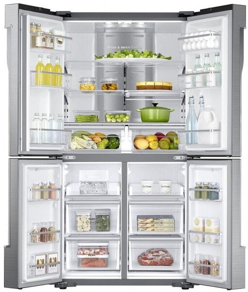 Великий об'єм робочої камери RF9000 дозволяє зберігати багато продуктів, розміщуючи страви різних розмірів. 4 двері широко відкриваються, щоб ви могли помітити всі інгредієнти в кожному куточку холодильника. Яскрава світлодіодне підсвічування добре висвітлює всі частини камери, дозволяючи швидко знаходити потрібні елементи живлення.