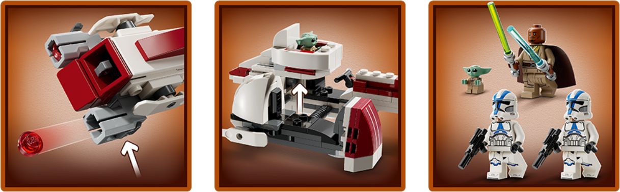 В этом наборе представлен игрушечный спидер-байк с коляской. Спидер оснащен кабиной для минифигурок и двумя стреляющими шипами, а ховерпрам Грогу можно прикрепить к съемной коляске. В игрушечный строительный набор также входит небольшая декорация и 3 минифигурки: Келлеран Бек с синим и зеленым световыми мечами, 2 клон-десантника 501-го отряда, каждый с бластером, а также фигурка Грогу (которого фанаты ласково называют «малыш Йода»), чтобы вдохновить на активную и творческую игру.