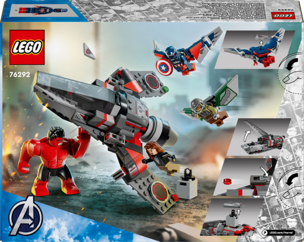 Собирайте истребитель с минифигурками Капитана Америки, Сокола, Красного Халка и Рут Бат-Сераф.