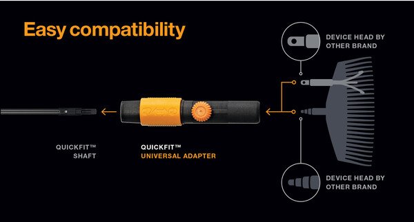Универсальный адаптер Fiskars QuikFit – это приспособление, позволяющее крепить насадки финской компании к черенкам любых других производителей. Изделие просто в использовании и обеспечивает надежную фиксацию рабочего элемента на ручке.