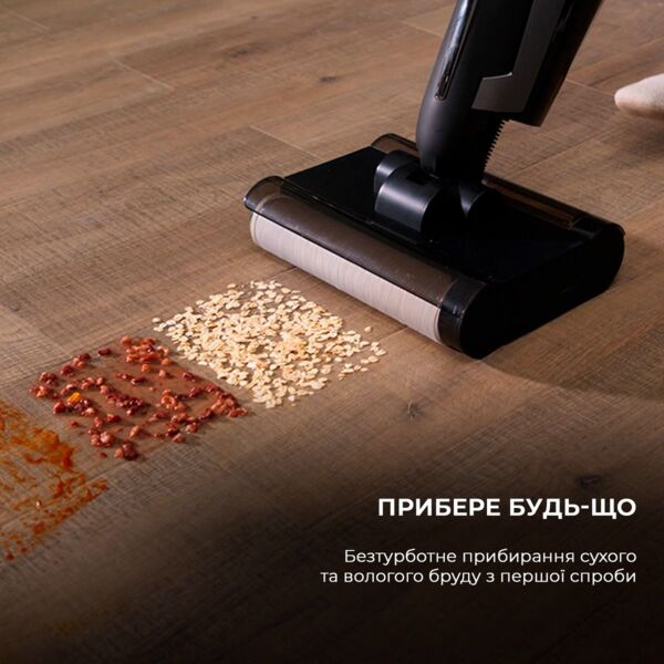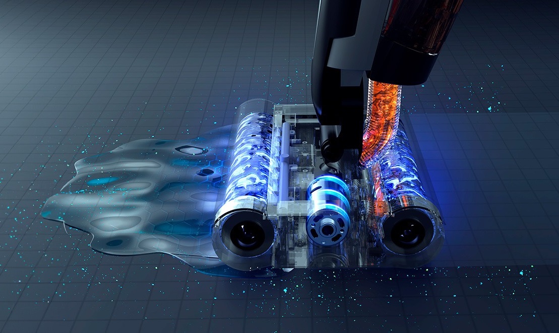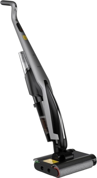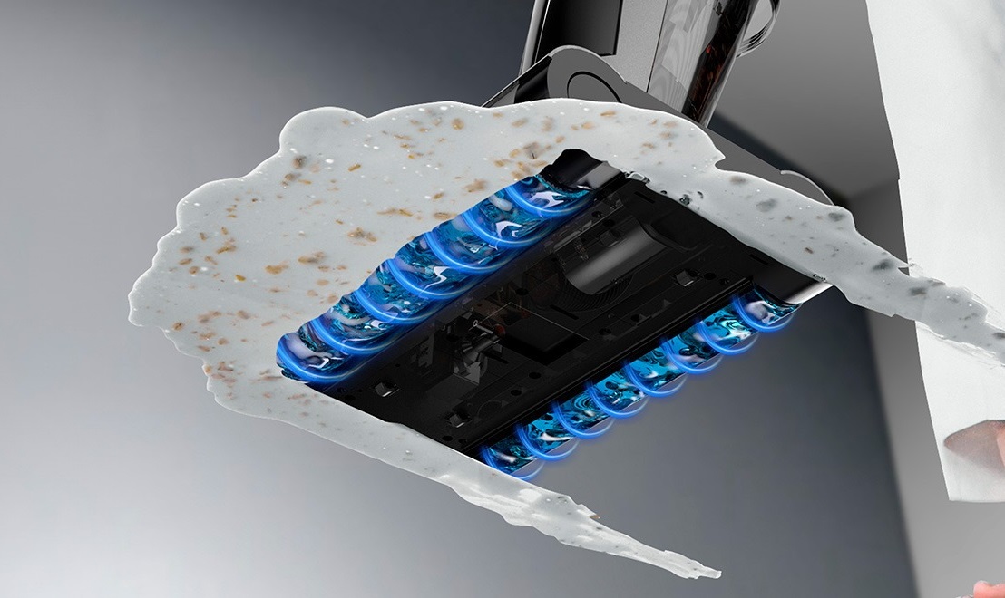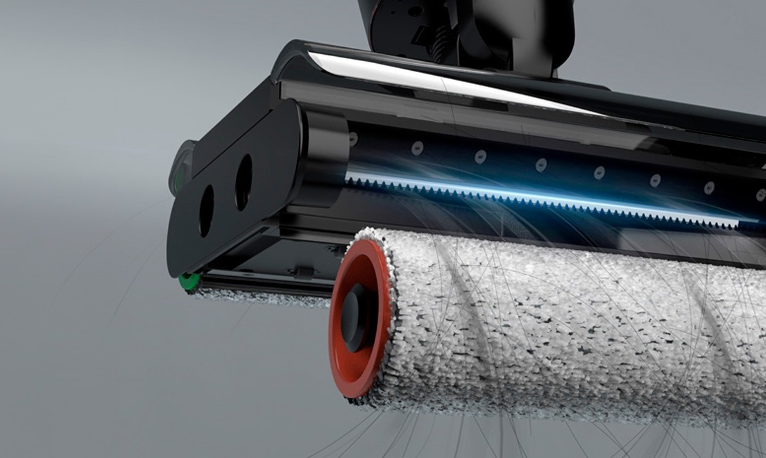 Конструкция основной щетки имеет специальные гребни, которые счищают с валиков волосы, мусор, отделяют воду и улучшают комфорт во время использования пылесоса. Во время и после уборки вам не придется очищать валик от мусора и волос вручную, пылесос справится с этой задачей самостоятельно. А расстояние от края валика до края корпуса составляет всего 6 миллиметров. За автономное питание пылесоса отвечает цифровой блок управления и встроенный аккумулятор емкостью 4000 мА/ч. Таким образом обеспечивается автономная работа до 30 минут на одном заряде, что соразмерно с уборкой помещения площадью до 120 квадратных метров. Для зарядки до 100% требуется 4 часа на станции.