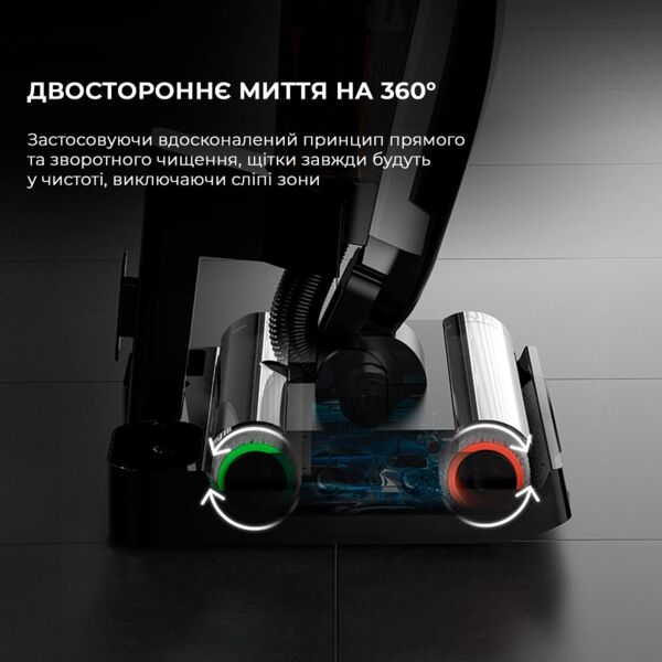 Основная щетка для мытья оборудована двумя мягкими валиками, которые контактируют с напольным покрытием и очищают его водой и моющим средством. Во время работы валики вращаются, на них автоматически подается чистая вода и высасывается грязная вода с мусором. Такое решение позволяет вдвое улучшить качество мытья пола с помощью одного девайса.