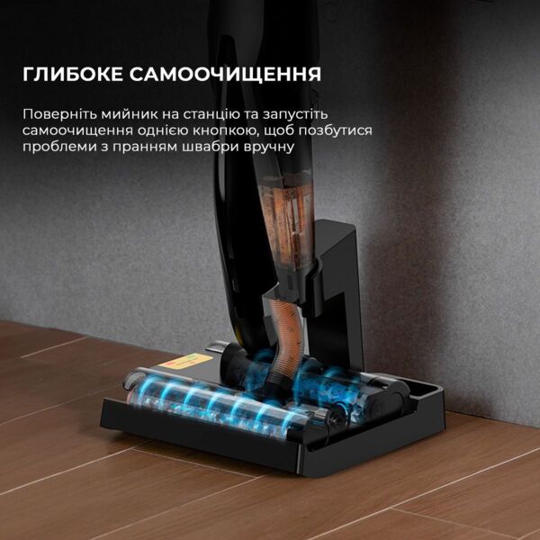 После того как вы закончили с уборкой напольных покрытий вы можете установить девайс на станцию для самоочистки и зарядки. После установки девайс может автоматически очистить моющие валики, промыть их чистой водой и высушить для безопасного хранения. Такое решение позволит вам сэкономить кучу времени на обслуживании. Во время самоочистки валики вращаются попеременно в разные стороны, что позволяет лучше вычистить частички пыли и мусора, попавшие внутрь ворса.