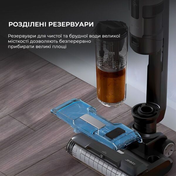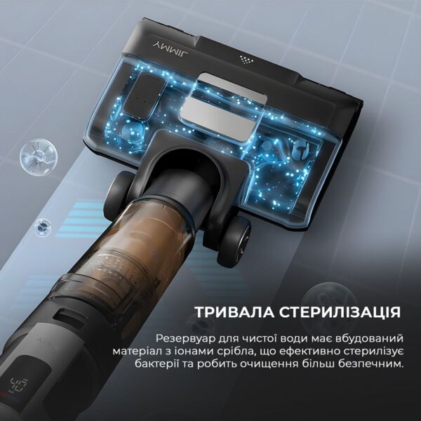 Бак для чистой воды используется для подачи влаги непосредственно перед щеткой для мытья пола. В этом резервуаре установлено устройство, генерирующее ионы серебра. Такая система позволяет обеззараживать воду для дальнейшего использования и мытья полов. Насыщенная ионами серебра вода дезинфицирует поверхность и убивает бактерии на своем пути. Моющий пылесос Jimmy HW9 способен убрать даже невидимые загрязнения.