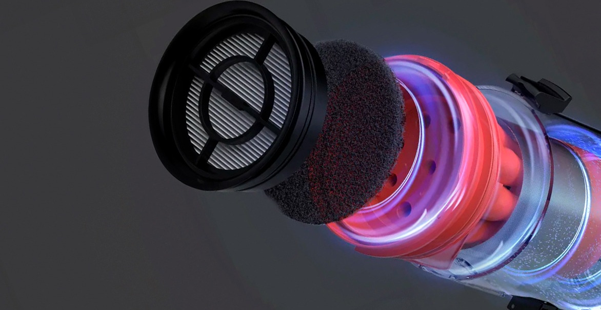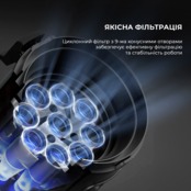 Deerma T30W Station оснащен 9-конусной циклонной системой фильтрации, которая эффективно очищает воздух, создавая мощные вихревые потоки для разделения пыли и мусора. Каждый из 9 конусообразных устройств образует собственный циклон, что позволяет лучше улавливать мелкие частицы и предотвращать засорение фильтра. Это обеспечивает постоянную мощность всасывания и улучшает качество воздуха на выходе, минимизируя необходимость частой очистки фильтра.