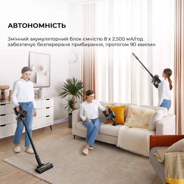 Пилосос дуже зручно тримати, він маневрений і легко обходить усі меблі. Завдяки відсутності проводів я можу прибирати будь-де, навіть у важкодоступних місцях, що раніше було проблемою. Попри свою легкість, у нього потужне всмоктування. Він чудово справляється з пилом, волоссям, шерстю домашніх тварин на будь-якій поверхні: від ламінату до килимів.