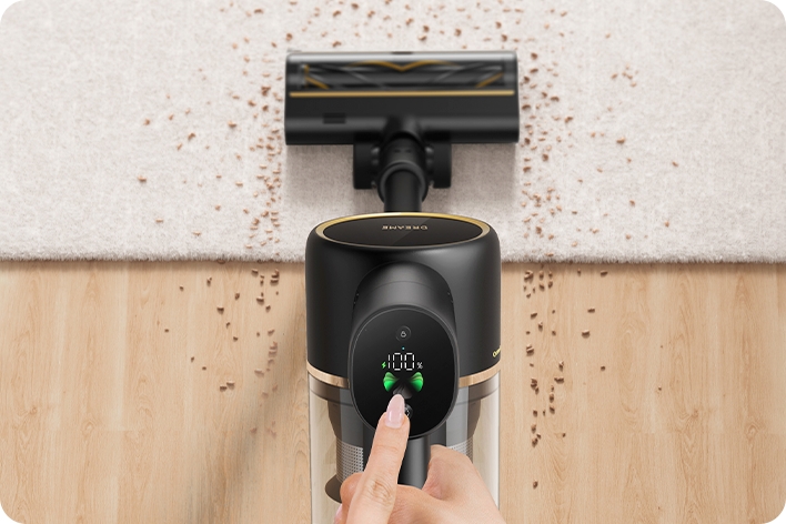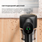 Светодиодный LED дисплей обеспечивает удобный мониторинг состояния устройства, показывая уровень заряда аккумулятора и выбранный режим уборки. Это позволяет мгновенно адаптировать настройки, переходя между режимами Eco, Med и Turbo всего одним касанием. Информация на экране четкая и понятная, что делает управление пылесосом максимально интуитивным. Благодаря этому вы всегда сможете поддерживать оптимальную мощность для различных типов уборки и знать, когда необходимо подзарядить устройство для продолжения работы.