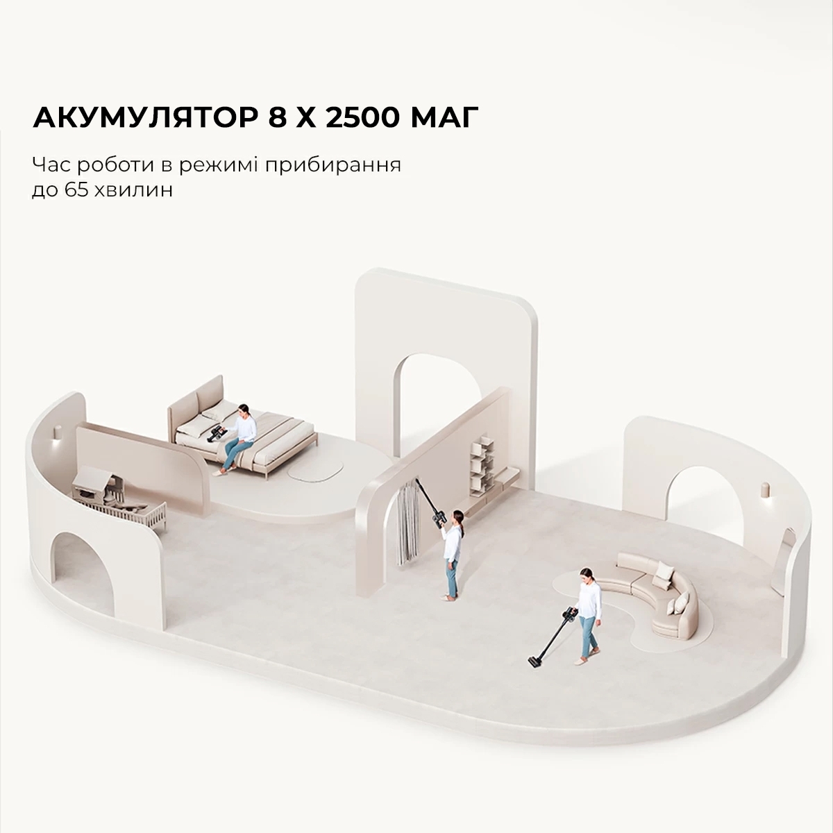 Аккумулятор Dreame включает восемь компонентов. Каждый из них - 2500 мАч. Один заряд позволяет убирать до 65 минут без подзарядки. Полностью зарядить аккумулятор можно за четыре часа. При необходимости вы можете купить дополнительный блок, чтобы сменить предыдущий или увеличить время уборки.