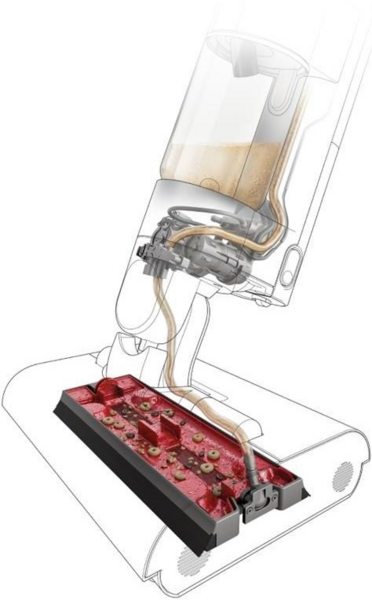 Два валика с индивидуальным питанием вращаются в разных направлениях, а импульсно-модулированный насос равномерно распределяет воду в 26 точно расположенных точках увлажнения по всей ширине каждого валика. Каждый ролик состоит из высокопоглощающей микрофибры с 64800 нитями на см². Сочетание высокой плотности микроволокон и постоянного нанесения чистой воды обеспечивает поглощение разлитой жидкости. Расположив два валика спереди и сзади машины, инженеры Dyson также достигли большего времени задержки на пятне с каждым проходом, что обеспечивает эффективное и быстрое удаление пятен.