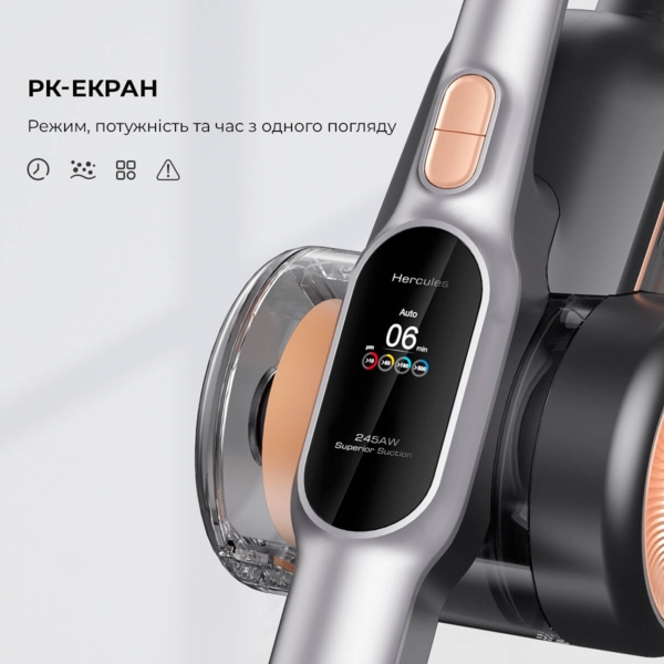 Во время уборки можно контролировать состояние пылесоса на встроенном экране на котором указано: оставшийся заряд батарейного блока с процентами, уровень загрязнения места уборки, режим работы и другая информация. В случае ошибки на экране появится соответствующее сообщение.