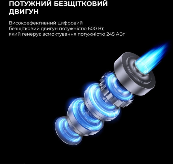 Независимо от размера мусора, его судьба одинакова - оказаться в контейнере для сбора мусора. Высокопроизводительный двигатель обеспечивает большую силу всасывания для уборки мусора фракций разного размера, от бактерий до круп. Сила всасывания достигает показателя 245 аэроВатт, для аккумуляторного пылесоса это достаточно высокий показатель. Бесщеточный электродвигатель имеет мощность целых 600 Ватт, за счет чего и достигается такая производительность.