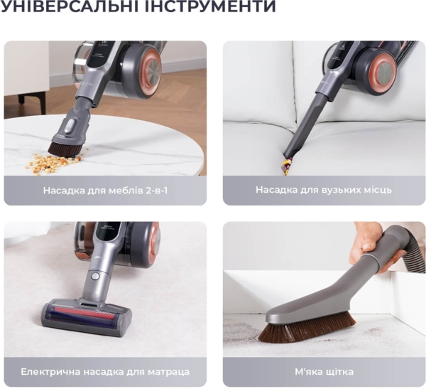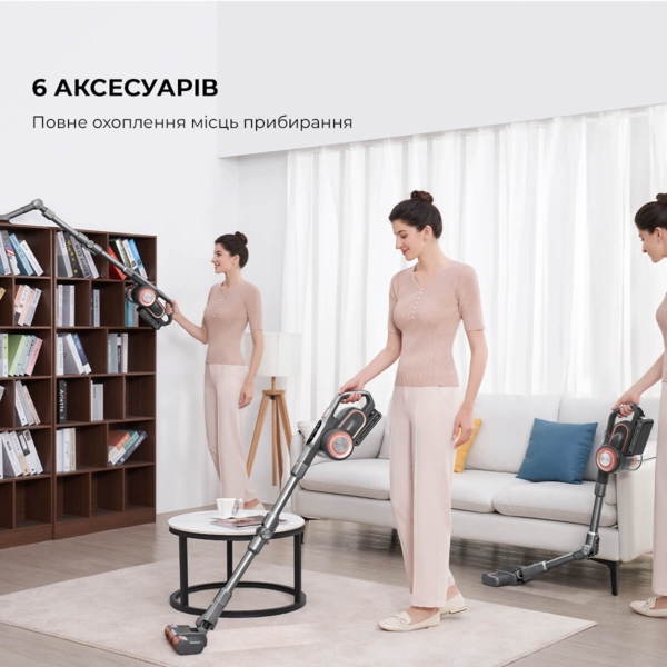 Внешне, от других моделей аккумуляторных пылесосов, H10 Pro легко отличить - акцентные вставки из пластика кораллового цвета, гибкая конструкция, светодиодный экран на рукоятке, съемная батарея, подставка для хранения и зарядки, наличие большого количества сменных наконечников и насадок для уборки.