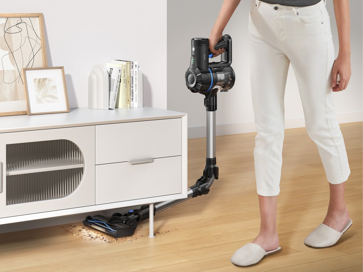 Благодаря специально расположенному складному элементу — гибкой трубке — пылесос легко проникает в низкие пространства, уменьшая потребность в наклонах и нагрузке на спину.