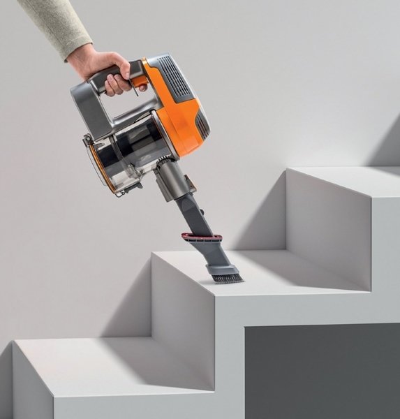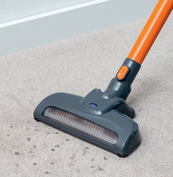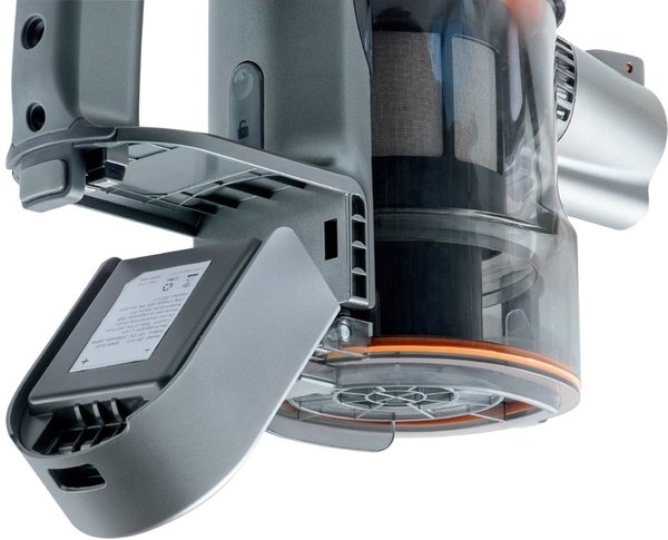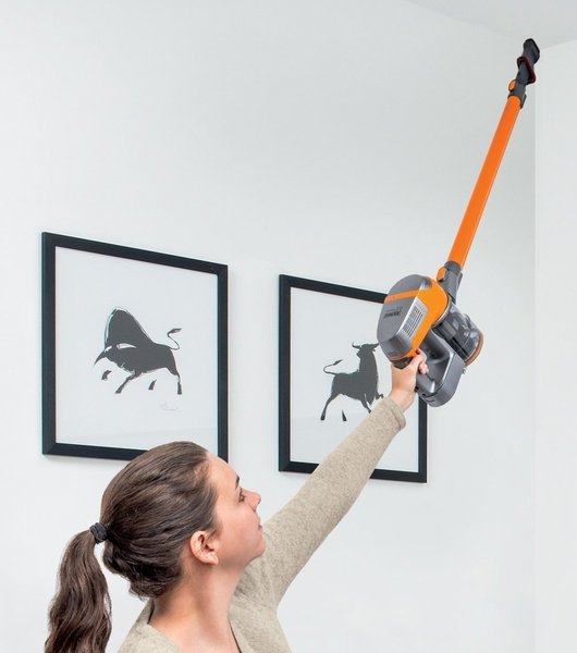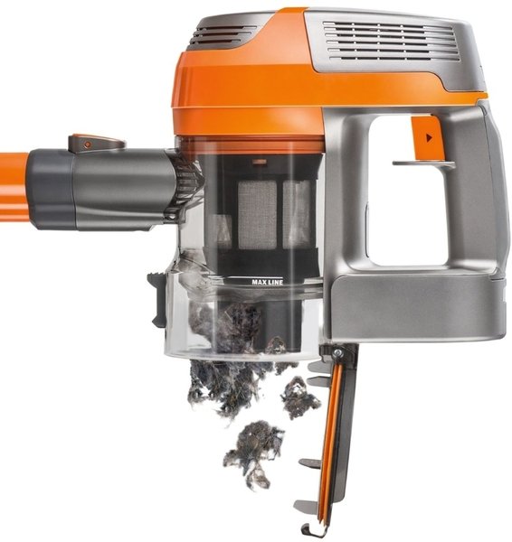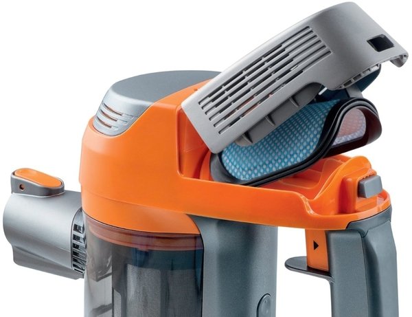 Главный узел пылесоса объединяет небольшой моторчик, аккумулятор, контейнер для мусора и фильтры. В корпусе выделена ручка с кнопкой, при нажатии на которую прибор втягивает пыль. Всегда можно установить подходящую насадку. Все они надежно фиксируются, не могут отсоединиться в процессе уборки. Можно пылесосить без штанги, присоединив непосредственно к прибору насадку «3 в одном».
