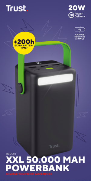 Описание Портативный аккумулятор Trust Redoh XXL 50000mAh 20W 3хUSB-A/USB-C, Black (25196_TRUST)