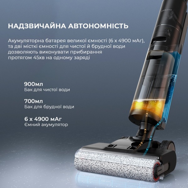 Время для генеральной уборки? Dreame проведет ее на одном заряде. Благодаря аккумулятору на 6x4900 мАч вы получаете до 45 минут автономности и можете очистить площадь 300 м². Водный резервуар рассчитан на 700 мл, а для сеанса достаточно одного наполнения.