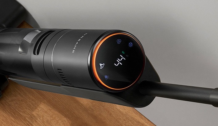 Дисплей показывает выбранный режим и уведомления о возможных ошибках. Если трубка или роликовая щетка засорена, в баке недостаточно воды или резервуар с отработанной жидкостью переполнен, вы увидите это на экране. Индикатор заряда светится зеленым, когда батарея заряжена более чем на 20%, и горит оранжевым, когда заряд меньше 20%.