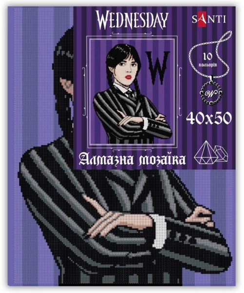 Окунитесь в таинственный и загадочный мир с алмазной мозаикой Wednesday Addams от Santi. Алмазная мозаика – творчество, не требующее специальных навыков и опыта, простая и интересная техника, которую легко освоит каждый. Отлично подходит для детей, подростков и взрослых. Увлекательный процесс выкладывания алмазных страз действует как арт-терапия, помогая снять стресс, улучшить концентрацию внимания и развить усидчивость.