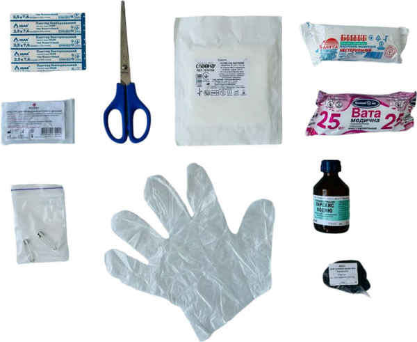 | Комплектация (возможны изменения в разных поставках) | Бинт нестерильный (5х0,1 м), Булавка английская - 2 шт, Вата нестерильная (25 г), Жгут тканевый с маячком, Лейкопластырь бактерицидный (на ПВХ основе) 2,5х7,6 - 2 шт., Ножницы тупоконечные, Перекись водорода 3% 40 мл, флакон, Перечень вложений, Перчатки п/э, Пленка клапан для проведения искусственного дыхания одноразовый, Салфетка для обработки ран стерильная 2 шт. в комплекте (10х10 см), Справочник оказания первой помощи, Футляр для аптечки |