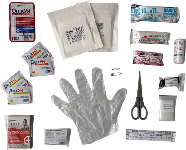 | Комплектация (возможны изменения в разных поставках) | Бинт нестерильный (5х,0,05 м), Бинт нестерильный (5х0,1 м), Бинт эластичный медицинский (1х0,08 м), Булавка английская - 2 шт, Жгут тканевый с маячком, Косынка медицинская перевязочная (50х50 см), Лейкопластырь бактерицидный (7,2х1,9 см) - 4 шт., Ножницы тупоконечные, Пакет перевязочный стерильный (13х11 см), Перечень вложений, Перчатки п/э, Пинцет стерильный, Пленка клапан для проведения искусственного дыхания одноразовый, Повязка гелевая антимикробная "ОпикУн" (5х5 см), Салфетка для обработки ран стерильная 2 шт. в комплекте (10см х 10см) - 2 шт., Салфетка медицинская антимикробная с фурагином (10х13 см) - 2 шт., Салфетка медицинская с хлоргексидином (6х10 см) - 2 шт., Сертификат, Справочник оказания первой помощи, Термопокрывало (210х160 см), Футляр универсальный пластиковый (210х160х70 мм) |