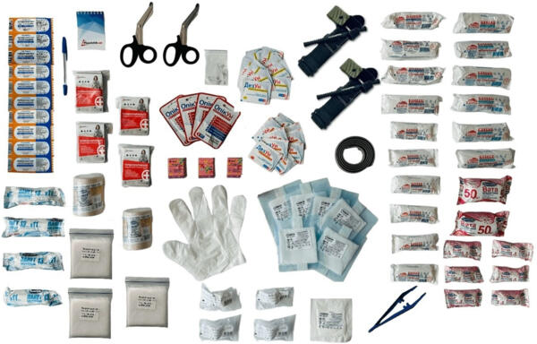 | Комплектация (возможны изменения в разных поставках) | Бинт нестерильный (5х0,05 м) - 6 шт., Бинт нестерильный (7х0,14 м) - 6 шт., Бинт стерильный (5х0,1 м) - 6 шт., Бинт стерильный (7х 0,14 м) - 4 шт., Бинт эластичный (5х0,1 м) - 2 шт., Блокнот, Булавка английская - 6 шт., Вата нестерильная (50 г) - 2 шт., Жгут кровоостанавливающий "Эсмарха", Жгут кровоостанавливающий турникет - 2 шт., Косынка медицинская перевязочная (136х96х96 см) - 3 шт., Лейкопластырь бактерицидный (7,2х1,9 см) - 10 шт., Ножницы тактические парамедицинские - 2 шт., Пакет перевязочный стерильный (13х11 см) - 4 шт., Перечень вложений, Перчатки - 4 шт., Пинцет стерильный, Пластырь медицинский фиксирующий (5х500 см) - 3 шт., Пленка клапан для проведения искусственного дыхания одноразовая - 4 шт., Повязка гелевая антимикробная "ОпикУн" (5х5 см) - 4 шт., Ручка шариковая, Салфетка для обработки ран стерильная 2 шт. в комплекте (10х10 см) - 6 шт., Салфетка для обработки ран стерильная 2 шт. в комплекте (7,5х7,5 см), Салфетка медицинская антимикробная с фурагином (10х13 см) - 9 шт., Салфетка медицинская с хлоргексидином (6х10 см) - 9 шт., Сертификат, Справочник оказания первой помощи, Термопокрывало (210х160 см) - 4 шт., Футляр для аптечки |