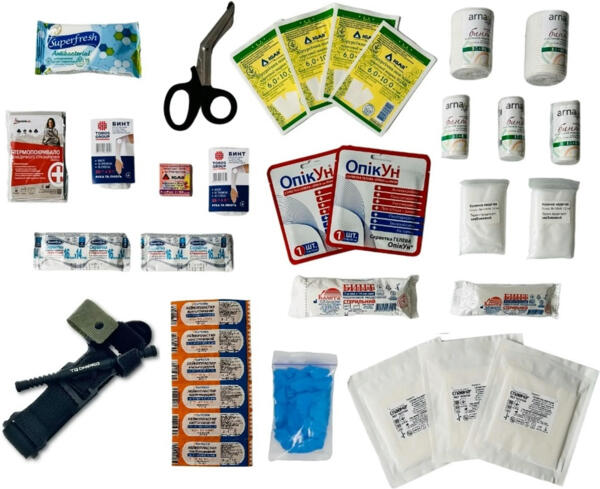 | Комплектация (возможны изменения в разных поставках) | Бинт стерильный (5х0,1), Бинт стерильный (7х0,14 м), Бинт эластичный (3х0,08 м) - 2 шт., Бинт эластичный медицинский (1х0,08 м) - 3 шт., Бинт эластичный сетчатый (25х3 см) - 2 шт., Влажные салфетки №15, Жгут кровоостанавливающий турникет, Косынка медицинская перевязочная (136х96х96 см) - 2 шт., Лейкопластырь бактерицидный (1,9х7,2 см) - 6 шт., Ножницы тактические парамедицинские, Перечень вложений, Перчатки - 2 шт., Пластырь медицинский фиксирующий (2х500 см), Салфетка гелевая "ОпикУн" (10х10 см) - 2 шт., Салфетка для обработки ран стерильная 2 шт. в комплекте (10х10 см) - 3 шт., Салфетка для обработки ран №1 (16х14 см) - 2 шт., Сертификат, Справочник оказания первой помощи, Термопокрывало (210х160 см), Футляр для аптечки, Хирургическая повязка типа Лайтпор (6х10 см) - 4 шт. |