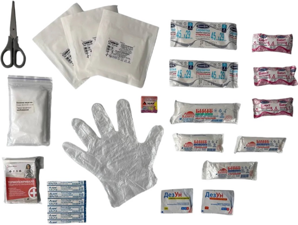 | Комплектация (возможны изменения в разных поставках) | Бинт нестерильный (5х0,05 м) - 3 шт., Бинт нестерильный (7х0,14 м), Бинт стерильный (7х0,14 м) - 3 шт., Косынка медицинская перевязочная (90х90 см), Лейкопластырь бактерицидный (на ПВХ основе) 2,5 х 7,6 см - 3 шт., Лейкопластырь катушечный (0,1х5 м), Ножницы тупоконечные, Перечень вложений, Перчатки п/э, Салфетка для обработки ран стерильная 2 шт. в комплекте (10х10 см) - 3 шт., Салфетка для обработки ран №1 (45х29 см) - 2 шт., Салфетка медицинская антимикробная с фурагином (10х13 см), Салфетка медицинская с хлоргексидином (6х10 см), Сертификат, Справочник оказания первой помощи, Термопокрывало (210х160 см), Футляр универсальный пластиковый (210х160х70 мм) |