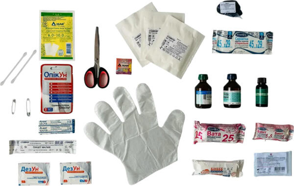 | Комплектация (возможны изменения в разных поставках) | Аммиака раствор (10%фл. 40 мл), Бинт нестерильный (5х0,05 м), Бинт стерильный (5х0,1), Булавка английская - 2 шт, Вата нестерильная (25 г), Ватные палочки - 2 шт., Диаматовый зеленый раствор (1% 20 мл), Жгут тканевый с маячком, Лейкопластырь бактерицидный (7,6х2,5 см), Лейкопластырь катушечный (0,01х5 м), Ножницы тупоконечные, Перекись водорода 3% 40 мл, флакон, Перечень вложений, Перчатки - 2 шт., Пинцет стерильный, Повязка гелевая антимикробная "ОпикУн" (5х5 см), Салфетка для обработки ран стерильная 2 шт. в комплекте (7,5х7,5 см) - 3 шт., Салфетка для обработки ран №1 (45х29 см), Салфетка медицинская антимикробная с фурагином (10х13 см) - 2 шт., Справочник оказания первой помощи, Устройство для искусственного дыхания, Футляр для аптечки, Хирургическая повязка тип Лайтпор (6х10 см) |