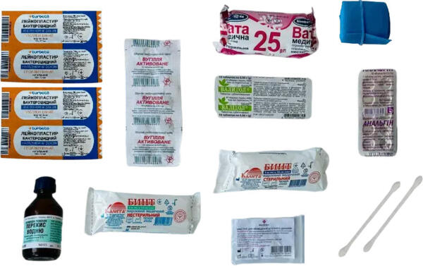 | Комплектация (возможны изменения в разных поставках) | Активированный уголь табл.№10, Анальгин табл. (0,5 № 10), Бинт нестерильний (7х0,14 см), Бинт стерильний (5х0,1 см), Валидол таблетки №10, Вата нестерильная (25 г), Ватные палочки - 2 шт., Жгут резиновый, Лейкопластырь бактерицидный (7,2х1,9 см) - 4 шт., Перекись водорода 3% 40 мл, флакон, Перечень вложений, Справочник оказания первой помощи, Устройство для искусственного дыхания, Футляр для аптечки |