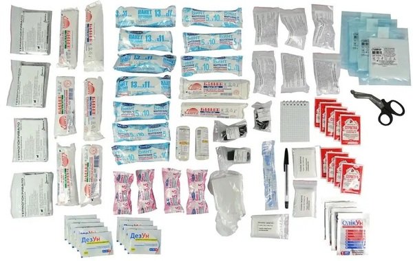 | Комплектация (возможны изменения в разных поставках) | Футляр для аптечки мягкий (30х18х12 см), Бинт нестерильний (7х0,14 м) - 4 шт., Бинт нестерильный (5х0,05м) - 4 шт., Бинт нестерильный (7х0,14 м) - 4 шт., Бинт стерильный (5х0,1м) - 6 шт., Бинт эластичный медицинский (0,08х1 м) - 2 шт., Блокнот, Жгут тканевый с маячком - 3 шт., Косынка медицинская перевязочная (50х50 см) - 3 шт., Пакет перевязочный стерильный (13х11 см) - 4 шт., Пара полиэтиленовых перчаток - 4 шт., Пинцет стерильный, Повязка гелевая антимикробная "ОпикУн" (5х5 см) - 4 шт., Ручка шариковая, Салфетка для обработки ран стерильная 2 шт. в комплекте (10х10 см) - 3 шт., Салфетка медицинская антимикробная с фурагином (10х13 см) - 9 шт., Салфетка медицинская с хлоргексидином (6х10 см) - 9 шт., Сертификат, Справочник оказания первой помощи, Термопокрывало (210х160 см) - 4 шт., Устройство для искусственного дыхания - 6 шт. |