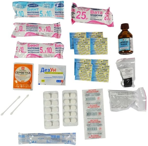 | Комплектация (возможны изменения в разных поставках) | Активированный уголь табл.№10, Анальгин табл. (0,5 № 10), Бинт нестерильный (5х0,1 м) - 2 шт., Бинт стерильный (5х0,01 м), ВАЛИДОЛ таб (0.06г №10), Вата нестерильная (25 г), Ватные палочки - 2 шт., Жгут тканевый с маячком, Лейкопластырь бактерицидный (на ПВХ основе) 2,5х7,6 см, Перекись водорода 3% 40 мл, флакон, Пинцет стерильный, Салфетка медицинская антимикробная с фурагином (10х13 см), Салфетка медицинская с хлоргексидином (6х10 см), Серветка спиртова №1 (3х6 см) - 8 шт., Сертификат, Справочник оказания первой помощи, Устройство для искусственного дыхания, Футляр полимерный красный (190х125х65 мм) |