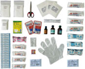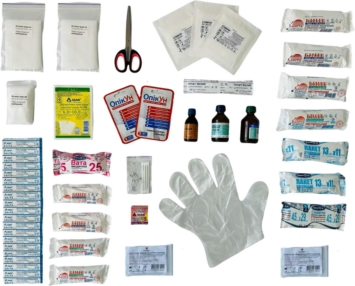 | Комплектация (возможны изменения в разных поставках) | Аммиака раствор (10%фл. 40 мл), Бинт нестерильный (5х0,1 м) - 2 шт., Бинт нестерильный (7х0,14 м) - 2 шт., Бинт стерильный (5х0,1 м) - 2 шт., Бинт стерильный (7х0,14 м) - 2 шт., Булавка английская - 6 шт., Вата нестерильная (25 г), Ватные палочки - 4 шт., Йод раствор (5% 20 мл), Косынка медицинская перевязочная (136х96х96 см), Косынка медицинская перевязочная (90х90 см) - 2 шт., Лейкопластырь бактерицидный (на ПВХ основе) 2,5х7,6 - 10 шт., Ножницы тупоконечные, Пакет перевязочный стерильный (13х11 см) - 2 шт., Перекись водорода 3% 40 мл, флакон, Перечень вложений, Перчатки - 4 шт., Пинцет стерильный, Пластырь медицинский фиксирующий (2х500 см), Повязка гелевая антимикробная "ОпикУн" (5х5 см) - 2 шт., Салфетка для обработки ран стерильная 2 шт. в комплекте (7,5х7,5 см) - 3 шт., Салфетка для обработки ран №1 (45х29 см), Справочник оказания первой помощи, Устройство для искусственного дыхания - 2 шт., Футляр для аптечки, Хирургическая повязка тип Лайтпор (6х10 см) |