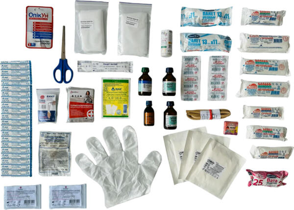 | Комплектация (возможны изменения в разных поставках) | Активированный уголь таблетки №10 - 2 шт., Аммиака раствор (10%фл. 40 мл), Бинт нестерильный (5х0,1 м) - 2 шт., Бинт нестерильный (7х0,14 м) - 2 шт., Бинт стерильный (5х0,1 м) - 2 шт., Бинт стерильный (7х0,14 м), Бинт эластичный медицинский (1х0,08 м), Бинт эластичный сетчатый (25х3 см), Вата нестерильная (25 г), Жгут резиновый, Йод раствор (5% 20 мл), Косынка медицинская перевязочная (90х90 см) - 2 шт., Лейкопластырь бактерицидный (на ПВХ основе) 2,5х7,6 см, Лейкопластырь катушечный (0,01х5 м), Напальчник медицинский - 10 шт., Ножницы тупоконечные, Пакет перевязочный стерильный (13х11 см) - 2 шт., Перекись водорода 3% (40 мл) - 2 шт., Перечень вложений, Перчатки - 4 шт., Пинцет стерильный, Повязка гелевая антимикробная "ОпикУн" (5х5 см), Салфетка для обработки ран стерильная 2 шт. в комплекте (10х10 см) - 3 шт., Справочник оказания первой помощи, Термопокрывало (210х160 см), Устройство для искусственного дыхания - 2 шт., Футляр для аптечки, Хирургическая повязка тип Лайтпор (6х10 см) |