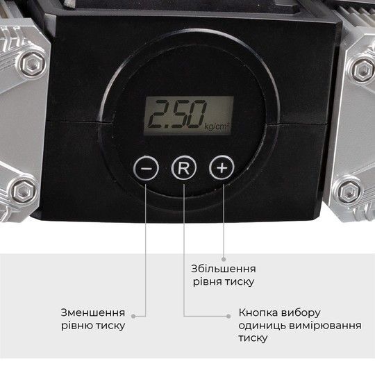 Удобство точного контроля давления при закачке колес гарантируется цифровым манометром с подсветкой символов, который имеет широкий спектр единиц измерения: BAR, PSI, KPA, KG/CM². А также автоматической функцией отключения компрессора при достижении заданного уровня давления.