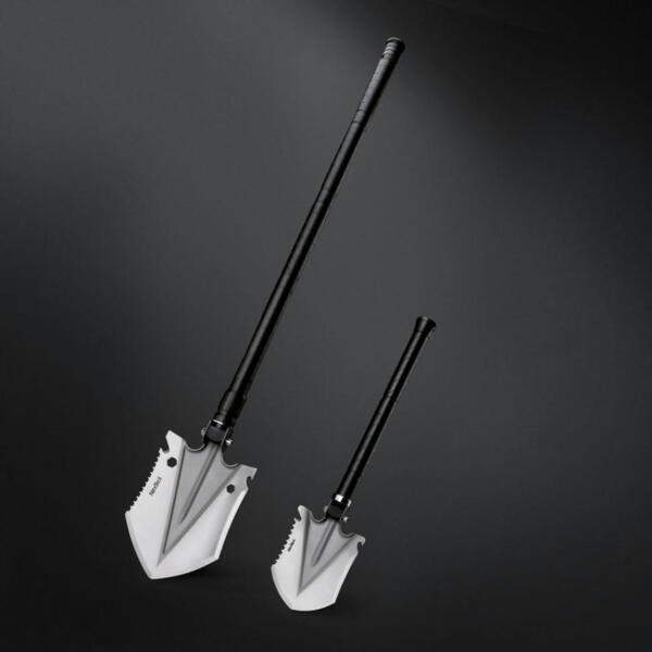 Лезвие лопаты имеет усовершенствованную V-образную форму с усиленным ребром жесткости, благодаря чему легко справляется с каменистой или промерзшей почвой. Его можно зафиксировать в одном из трех положений: под углом 30°, 85° или 180°, что расширяет возможности использования — от копания до рубки. Лезвие изготовлено из мартенситной нержавеющей стали 20Cr13 толщиной 2,5 мм. Благодаря твердости 45 HRC металл сохраняет форму даже во время тяжелых работ. Встроенный ударный элемент из вольфрамового сплава разбивает даже закаленное стекло, а съемные детали позволяют быстро переключаться между функциями одним движением. Все элементы хранятся внутри рукояти, что экономит место и обеспечивает порядок при транспортировке.