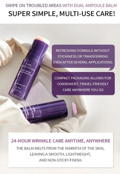 Клинически доказано, что бальзам-стик Time Revolution Night Repair Ampoule улучшает глубину и внешний вид морщин, оказывая длительное действие в течение 24 часов.