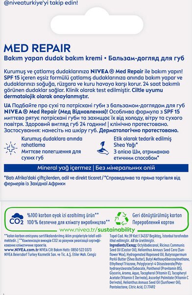 Бальзам-уход для губ Nivea Med Repair быстро впитывается в кожу губ и придает длительное увлажнение. Бальзам также имеет приятный натуральный аромат, который делает его использование еще более приятным. Кроме того, бальзам имеет в составе фактор защиты SPF 15, что обеспечивает дополнительную защиту от солнечных лучей, помогая предотвратить вредное воздействие ультрафиолетового излучения на губы.
