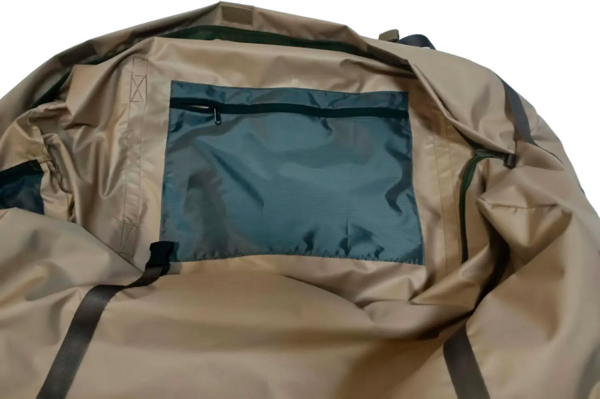 - Молния с двумя бегунками на всю длину баула, сверху прикрывается клапаном на липучках для защиты от воды и грязи;