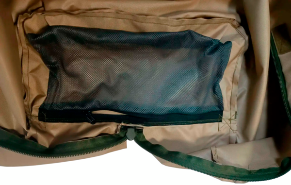 - Внутри два кармана на молниях: маленький торцевой из сеточки (видно содержимое) и больший боковой из рип-стопа, куда можно положить папку формата А4;