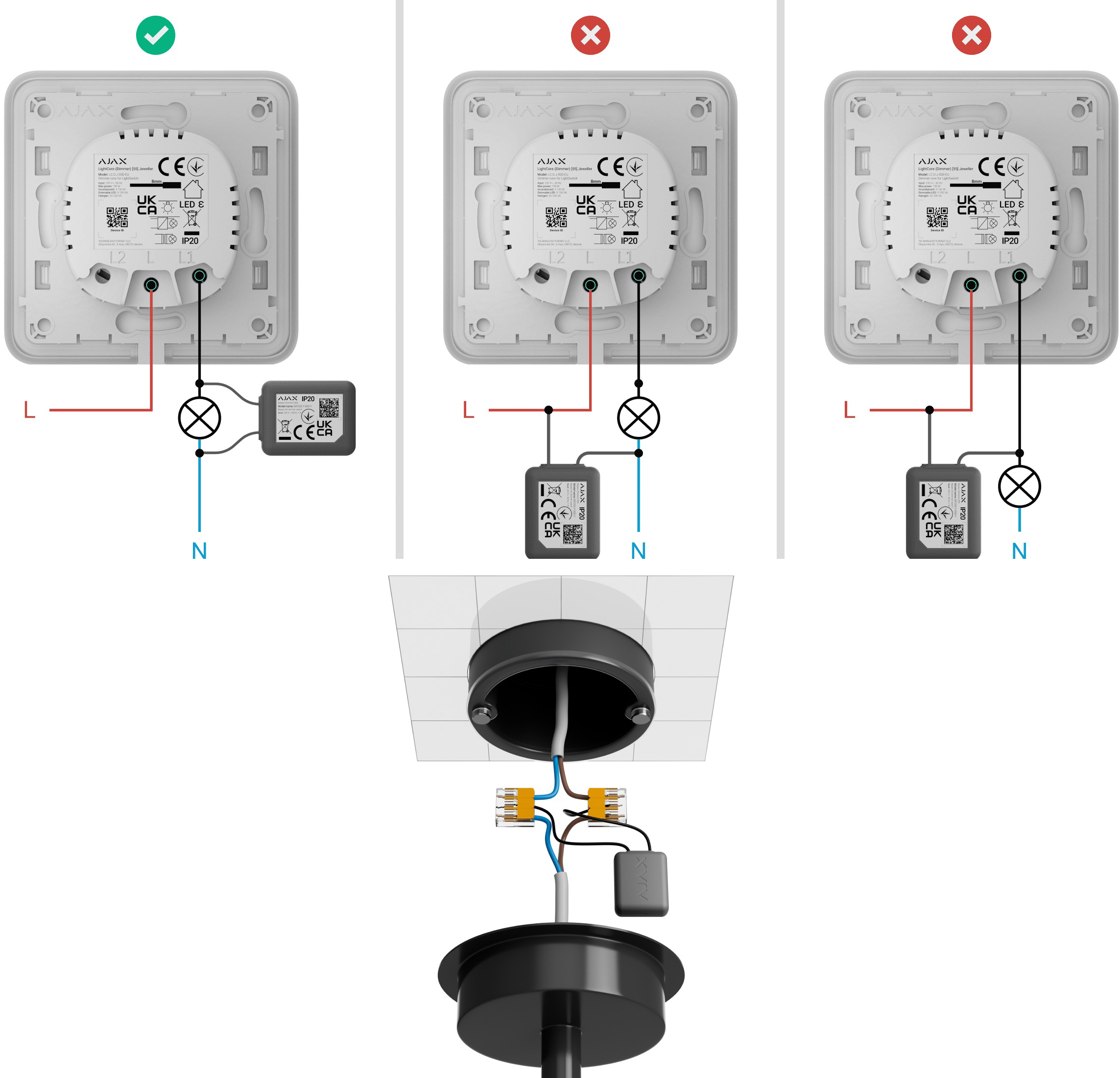 Место установки Bypass (Dimmer) [55] должно соответствовать рекомендациям по монтажу диммера, поэтому необходимо их соблюдать на этапе проектирования системы Ajax для объекта. Есть два способа установки байпаса: в монтажную коробку осветительного прибора или диммера.