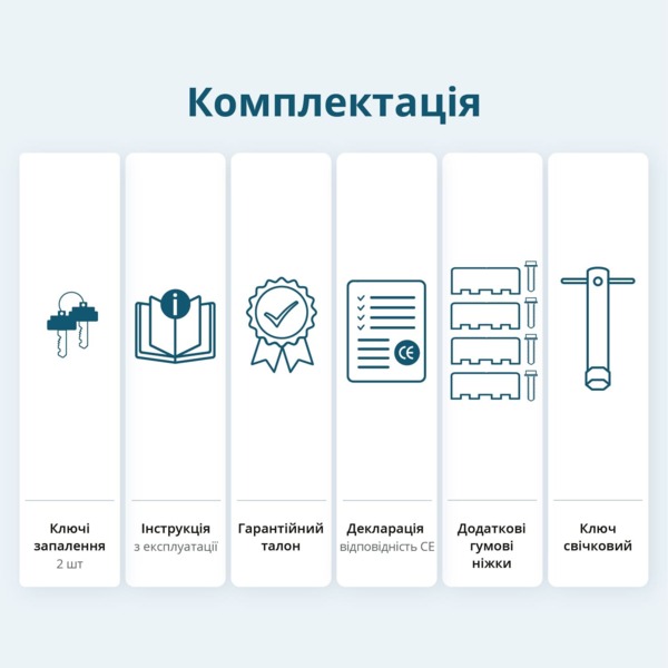 | Комплектация (возможны изменения в разных поставках) | Генератор, Документация, Ключ запуска, Свечной ключ |