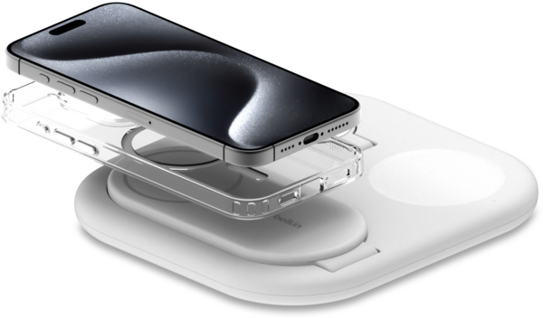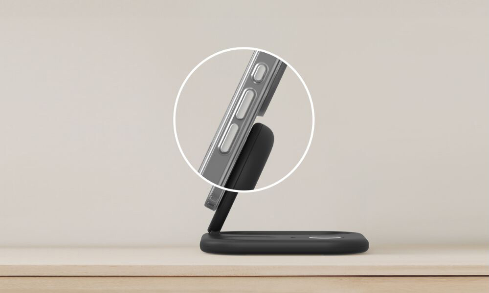 Магнитное соединение Qi2 легко выравнивает телефон, а материал из жидкой силиконовой резины обеспечивает мягкое прикосновение для его защиты. Кроме того, прочное нескользящее основание удерживает зарядное устройство на месте, а прочный шарнир гарантирует многолетнее использование.