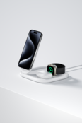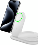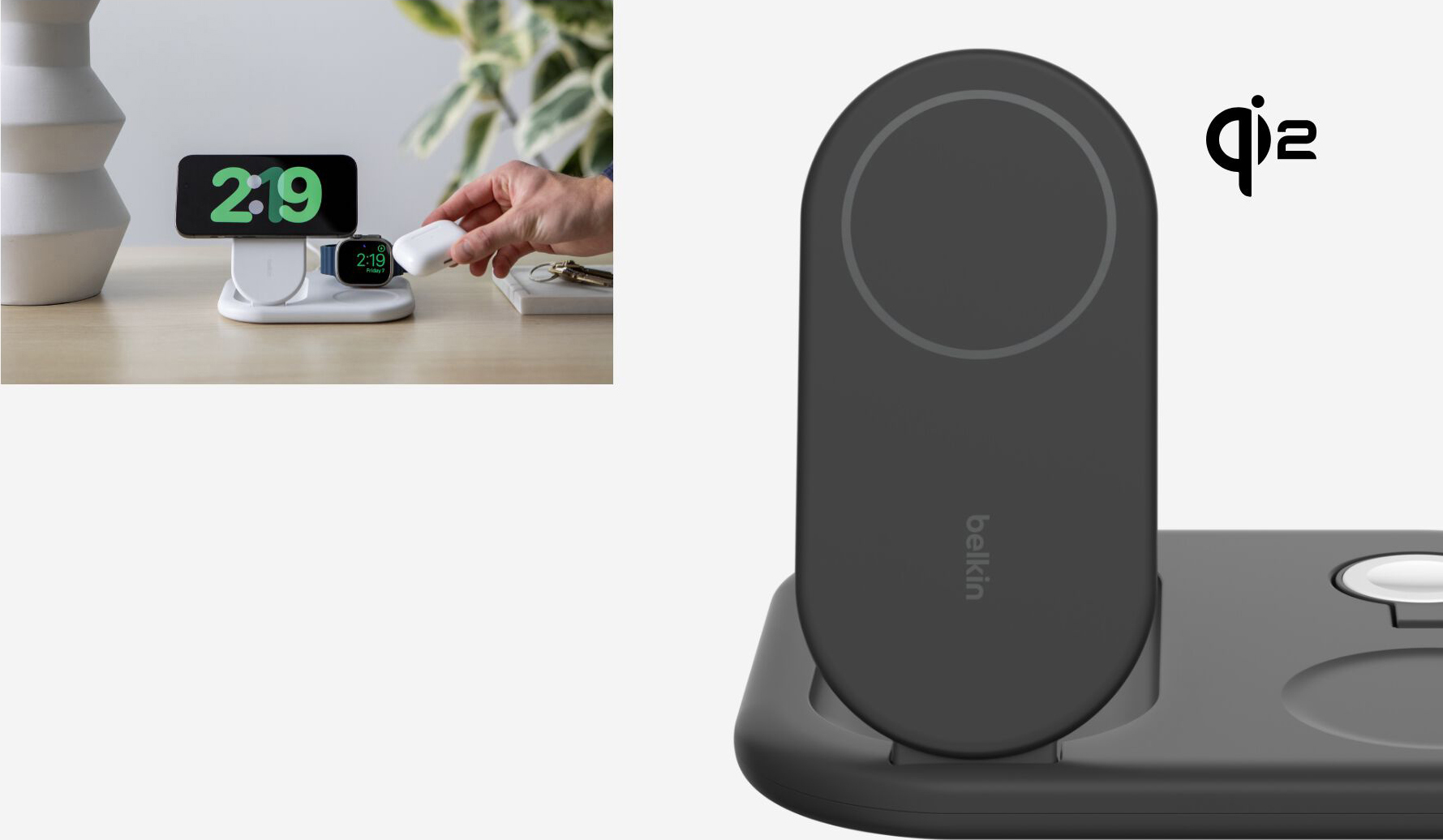 Удобно поместите телефон на зарядную станцию 3 в 1, чтобы быстро зарядить iPhone или устройство, совместимое с технологией Qi2, мощностью до 15 Вт. Благодаря технологии Qi2 беспроводная зарядка происходит в 2 раза быстрее, поэтому вы можете тратить меньше времени на ожидание!