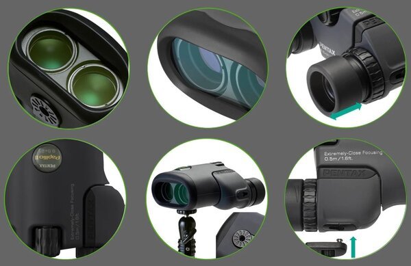 - Long eye relief design - значительное удаление выходного зрачка, предлагаемое во всей спортивной оптике Pentax, позволяет зрителю видеть все поле зрения четко и без усилий. Это особенно полезно для тех, кто носит очки и позволяет смотреть в течение длительного времени без дополнительной нагрузки на глаза.