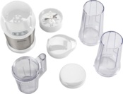 Блендер имеет высококачественные, острые и прочные ножи, которые можно применять для измельчения всех типов фруктов, овощей и мяса. Специальные насадки способны измельчать лед, твердые продукты вроде орехов, а также молоть кофейные зерна.