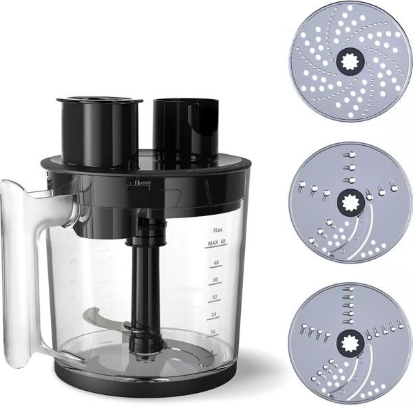 Прикрепите компактный измельчитель, чтобы нарезать лук и зелень, измельчить орехи и прочее. Чаша объемом 0,5 литра подойдет для всех мелких задач, которые могут возникнуть во время приготовления пищи.