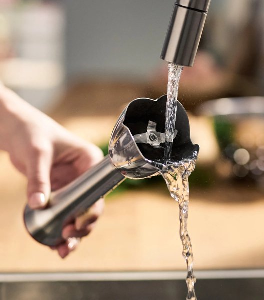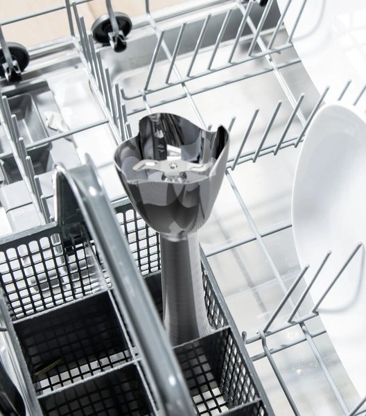 После использования прибора просто нажмите на кнопки с обеих сторон корпуса и отсоедините ножку блендера. Аксессуары пригодны для мытья в посудомоечной машине (кроме аксессуаров с электроприводом).