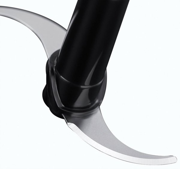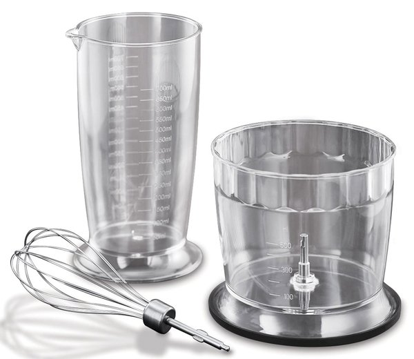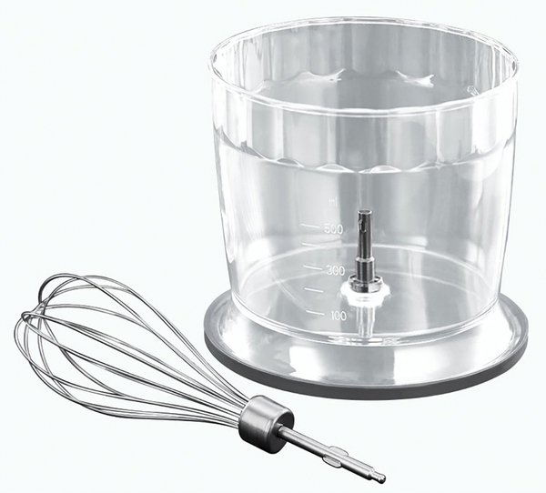 Погружная насадка с четырьмя лезвиями отлично справится с приготовлением пюре и смешиванием. Венчик быстро взобьёт сливки для торта, белки для безе или замесит жидкое тесто. Измельчитель эффективен при переработке овощей, зелени, орехов и твёрдых сортов сыра. Точно отмерить все ингредиенты поможет мерный стакан объемом 0.7 литра, который можно использовать и для хранения сделанной заготовки.